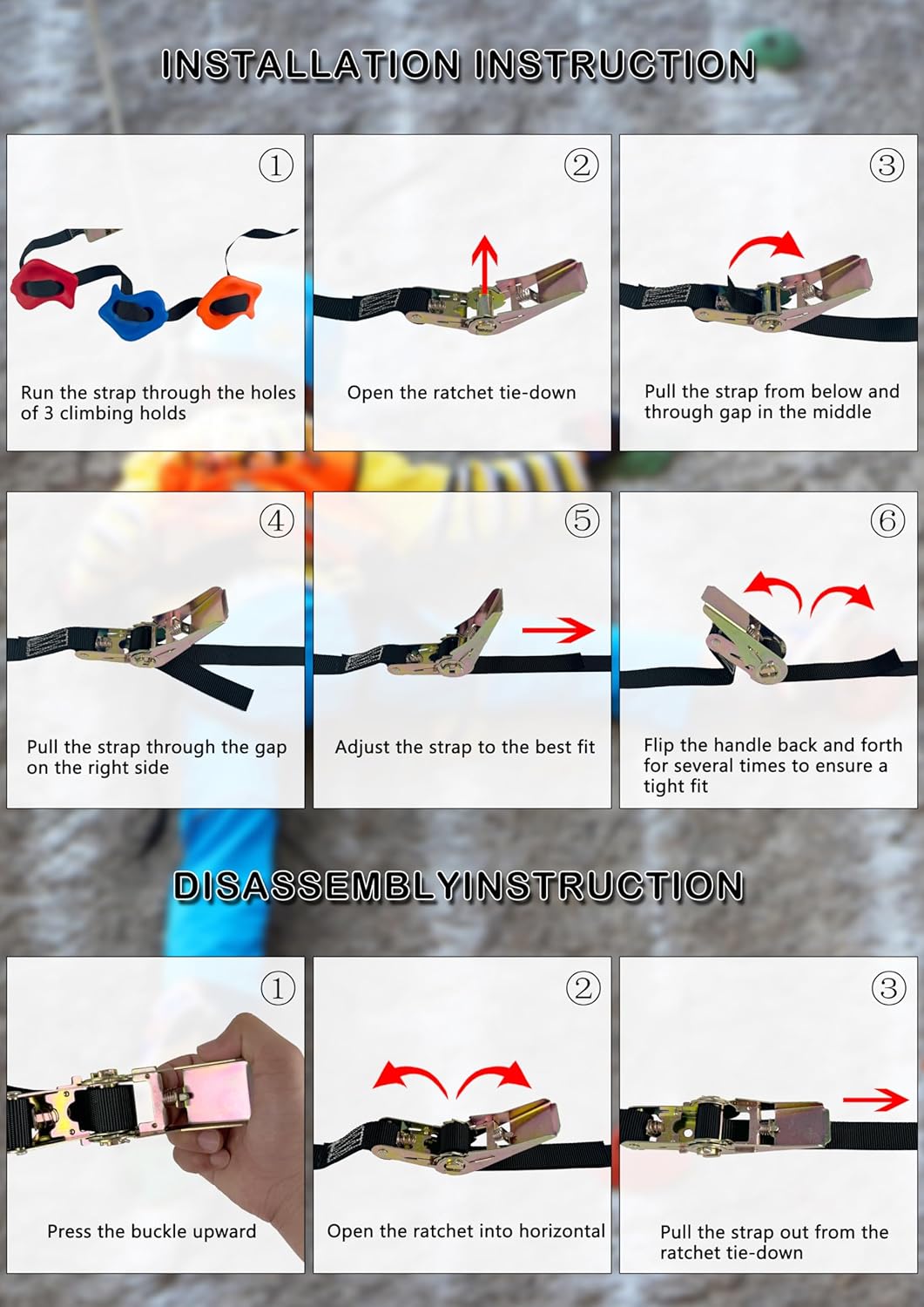 - 【Used for Tree without No Low Branches】16pc colorful climbing rocks holds, 6 x 6 Ft ratchet tie down straps, make it possible for using without other accessories, tools, or putting nails in the tree, the holds can be snug to the tree safely. Please do not weight more than 230 pounds.