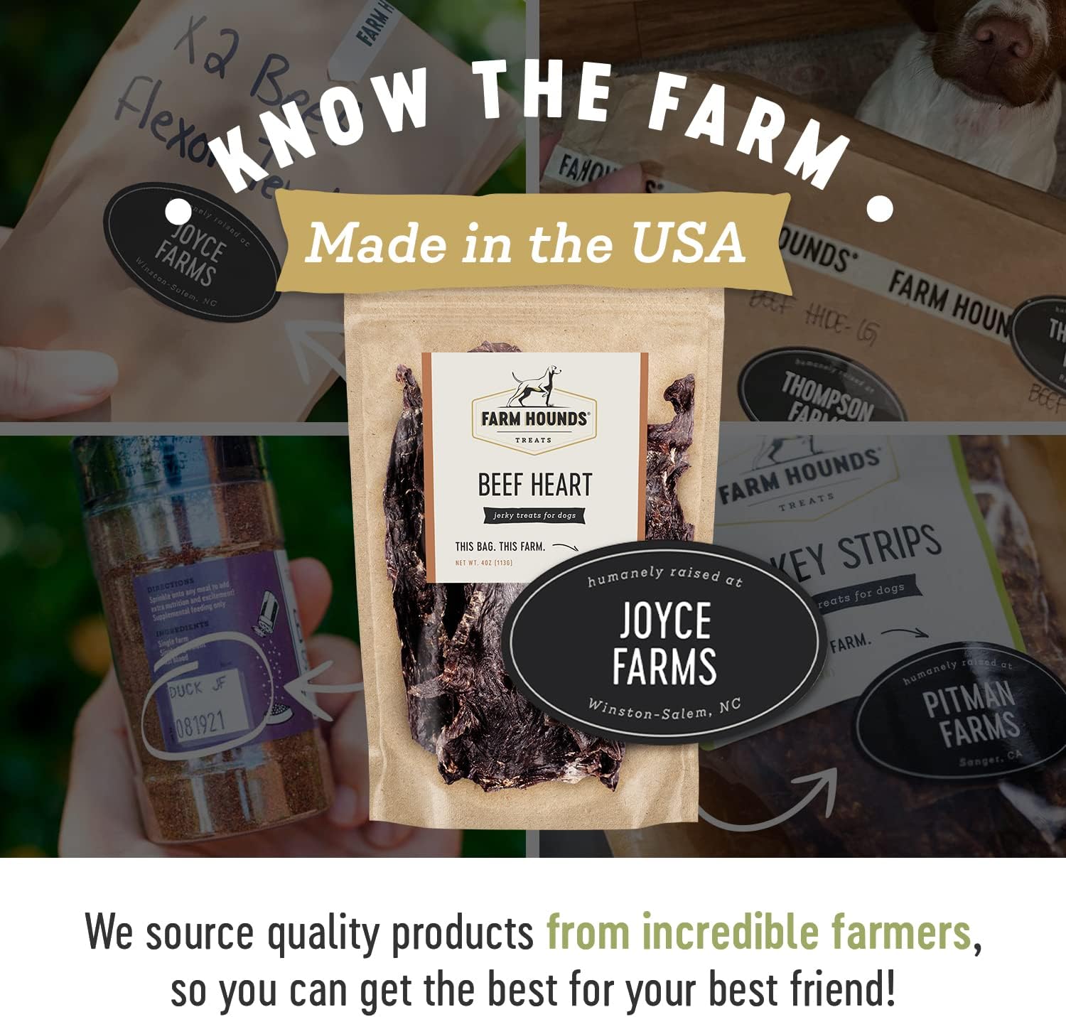 - FARM HOUNDS - At Farm Hounds, we believe healthier animals are happier animals. With your canine in mind, we make all of our treats nutritionally beneficial and delicious. Our close relationship with all-American family farmers who raise their animals in a humane way, helps us use premium raw materials for our products.