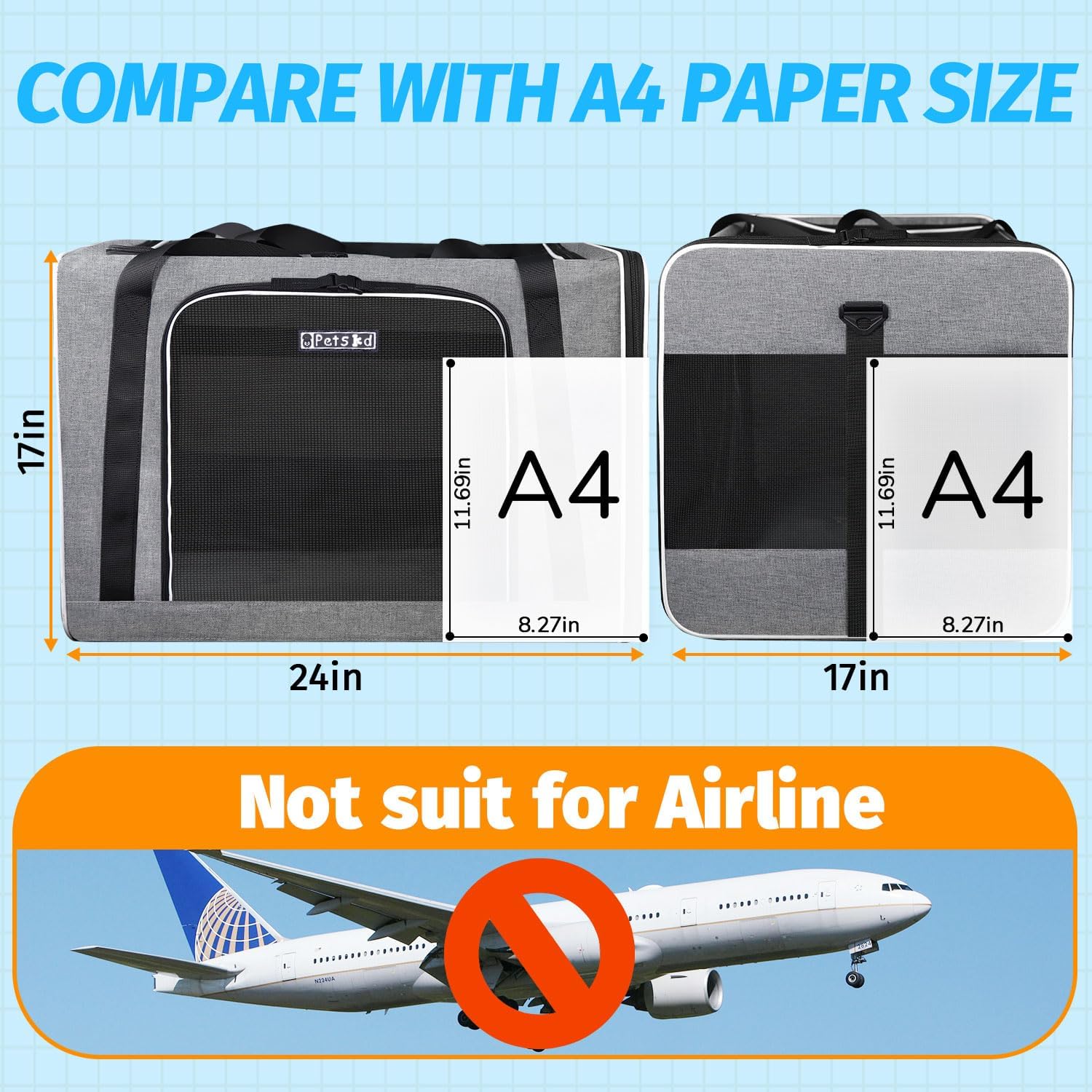 - 【EXTRA LARGE SPACE】Petskd pet carrier size:24"x17"x17", Suitable for pets up to 55 pounds. perfect for a medium dog or several small cats. The large pet carrier is great for car travel with your pet, taking your pet to the hospital and camping. Provide a machine washable mat cover and hard bottom pad to support the bottom.