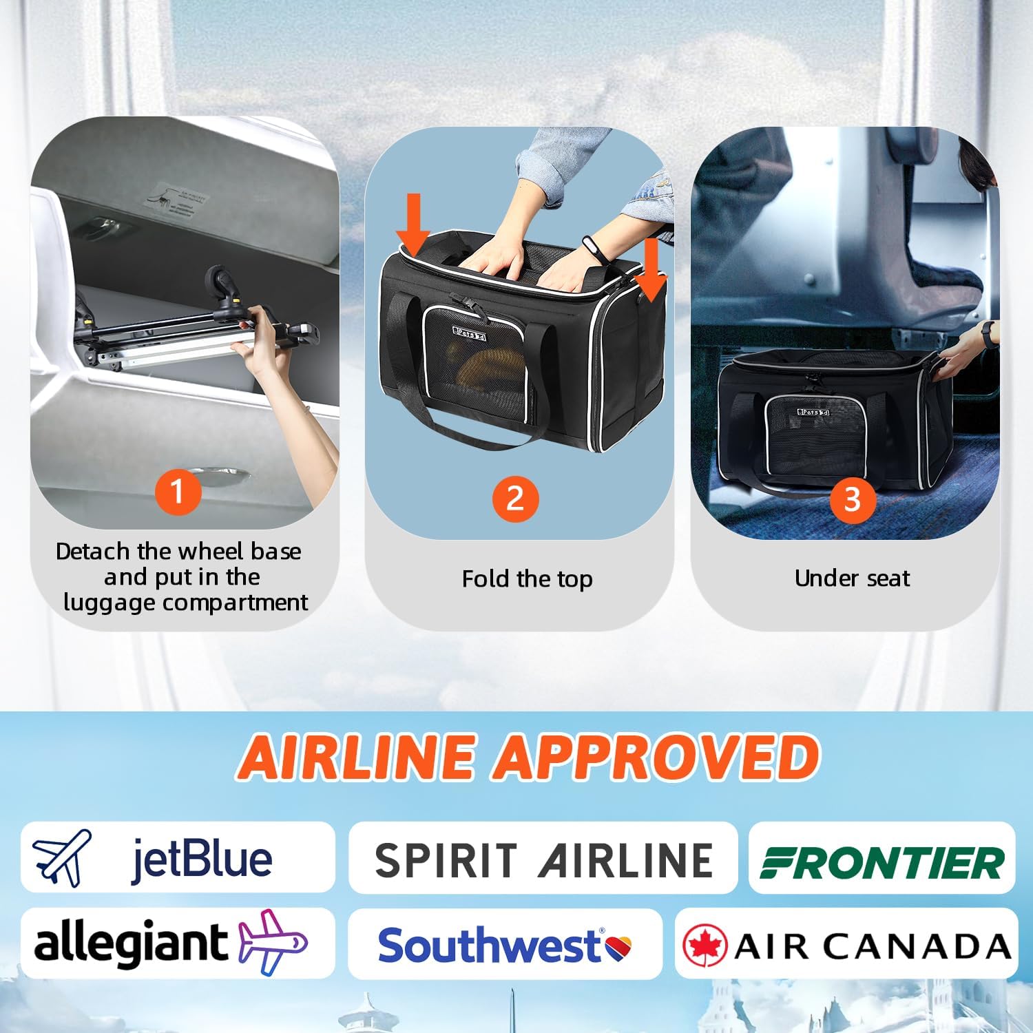 - 【AIRLINE APPROVED CARRIER 】Unfolded size:17"L×12"W×(8.5+3.5)"H, Petskd pet carrier is TSA approved and can be placed under the seat in the cabin(after remove the wheel base), it is mainly designed for ①JetBlue Airlines ②Allegiant Airlines ③Spirit Airlines ④Frontier Airlines, but also in compliance with ⑤Southwest Airlines⑥Air Canada. We recommend you buy this carrier when you fly with the above-mentioned airlines.