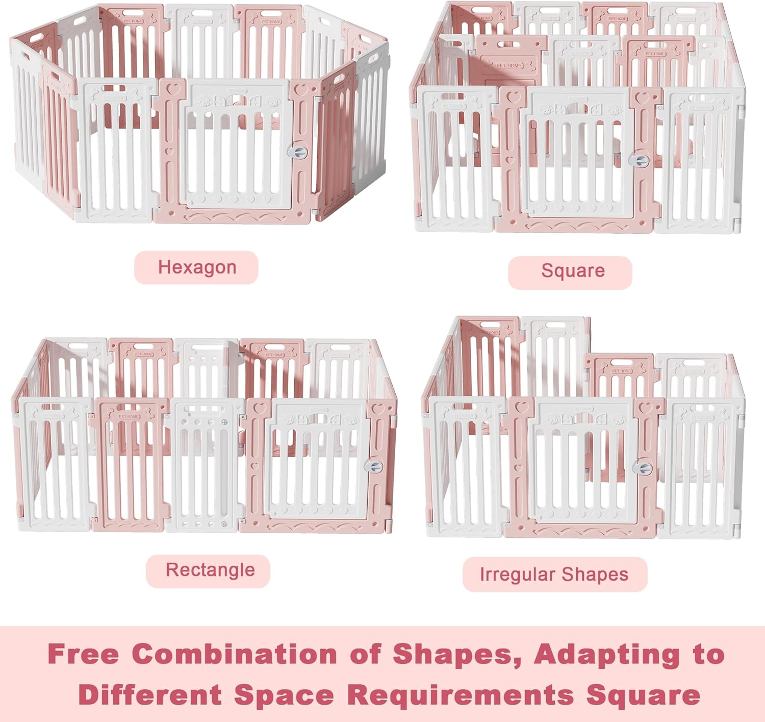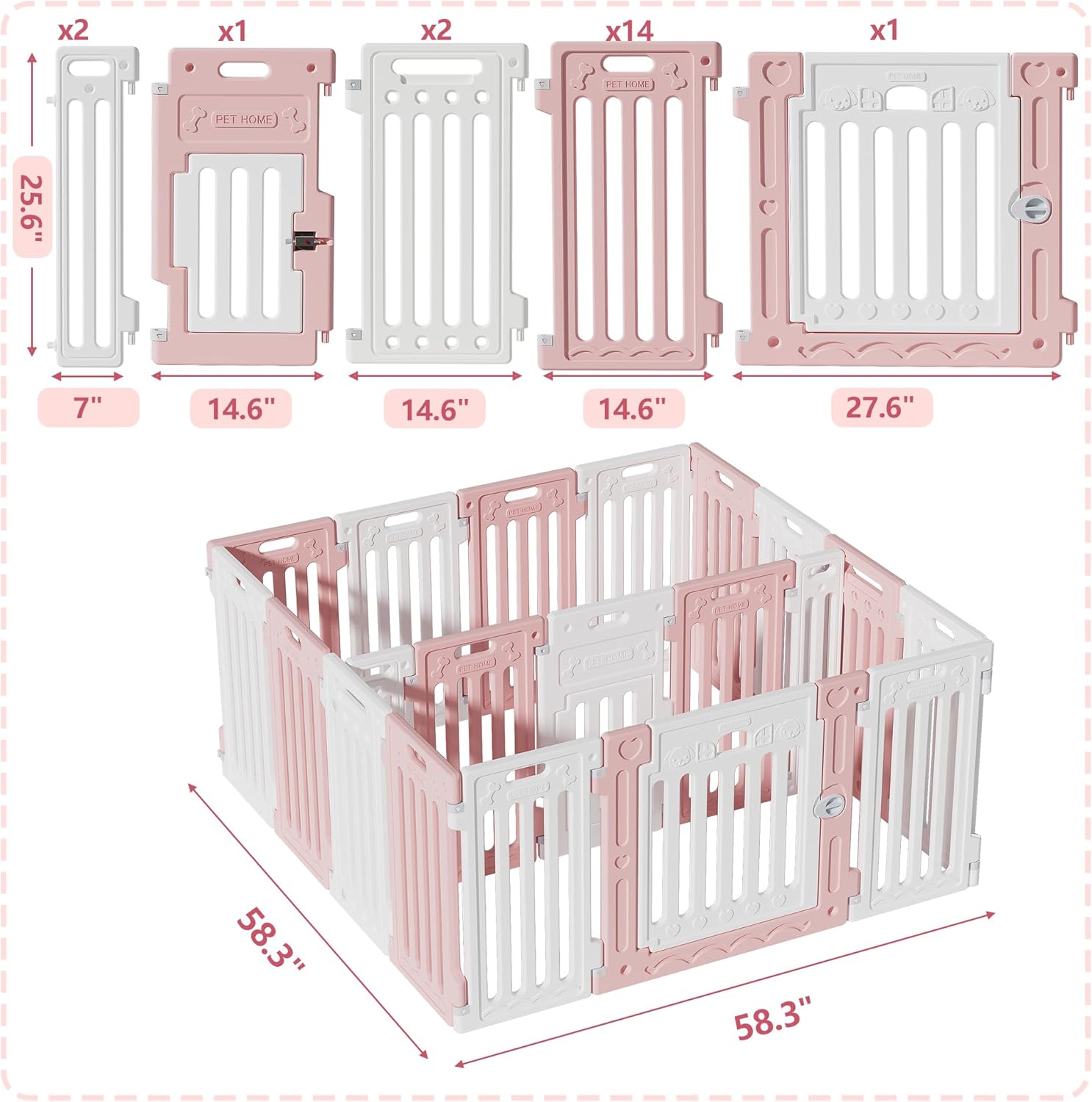 2 Room Dog Playpen with Door,DIY Shape Combination Puppy Pen,16-Panel+2 Link Piece+Large Door+Small Door,25.5" H Dog Fence,Non-Slip&Secure Pet Gate,Easy to Assemble,Pink + White