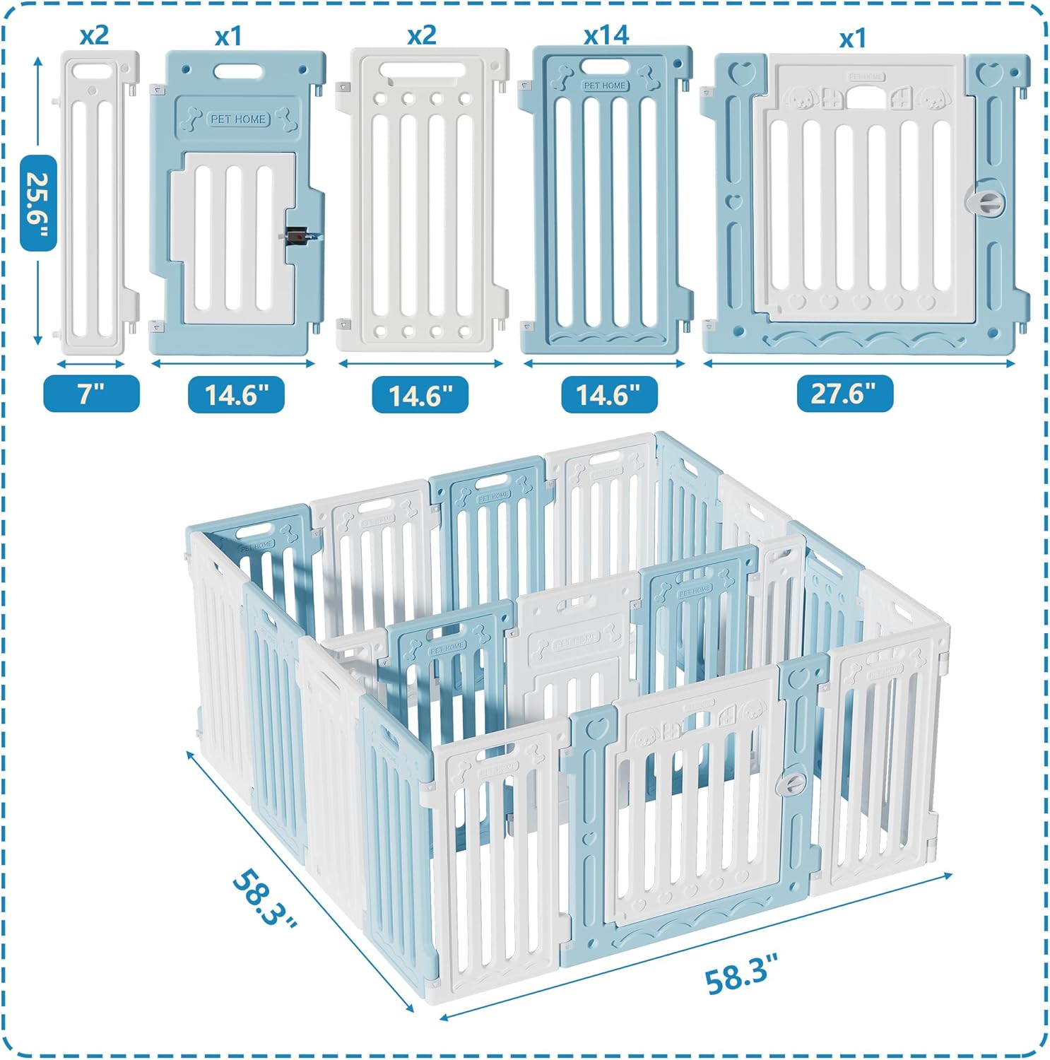 2 Room Dog Playpen with Door,DIY Shape Combination Puppy Pen,16-Panel+2 Link Piece+Large Door+Small Door,25.5" H Dog Fence,Non-Slip&Secure Pet Gate,Easy to Assemble,Blue+White