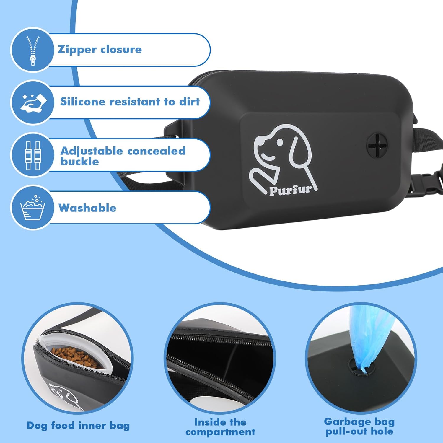 - Easy-Access Zipper & Organized Interior: The main zipper opens smoothly with one hand for quick treat access. Includes a small inner silicone pouch designed to keep the main compartment clean and organized — ideal for storing loose treats neatly in place