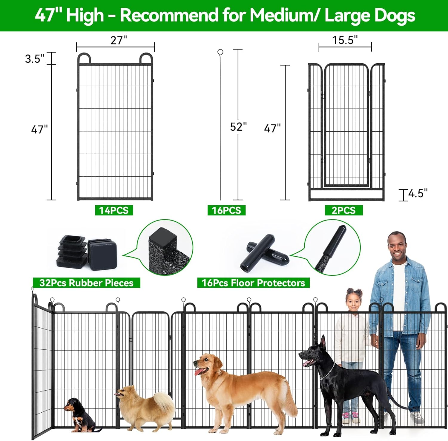 Dog Playpen Outdoor 16 Panels Heavy Duty Dog Fence 47" Height Anti-Rust with Doors Portable for RV Camping Yard, Total 36FT, 103 Sq.ft, Snowy Black