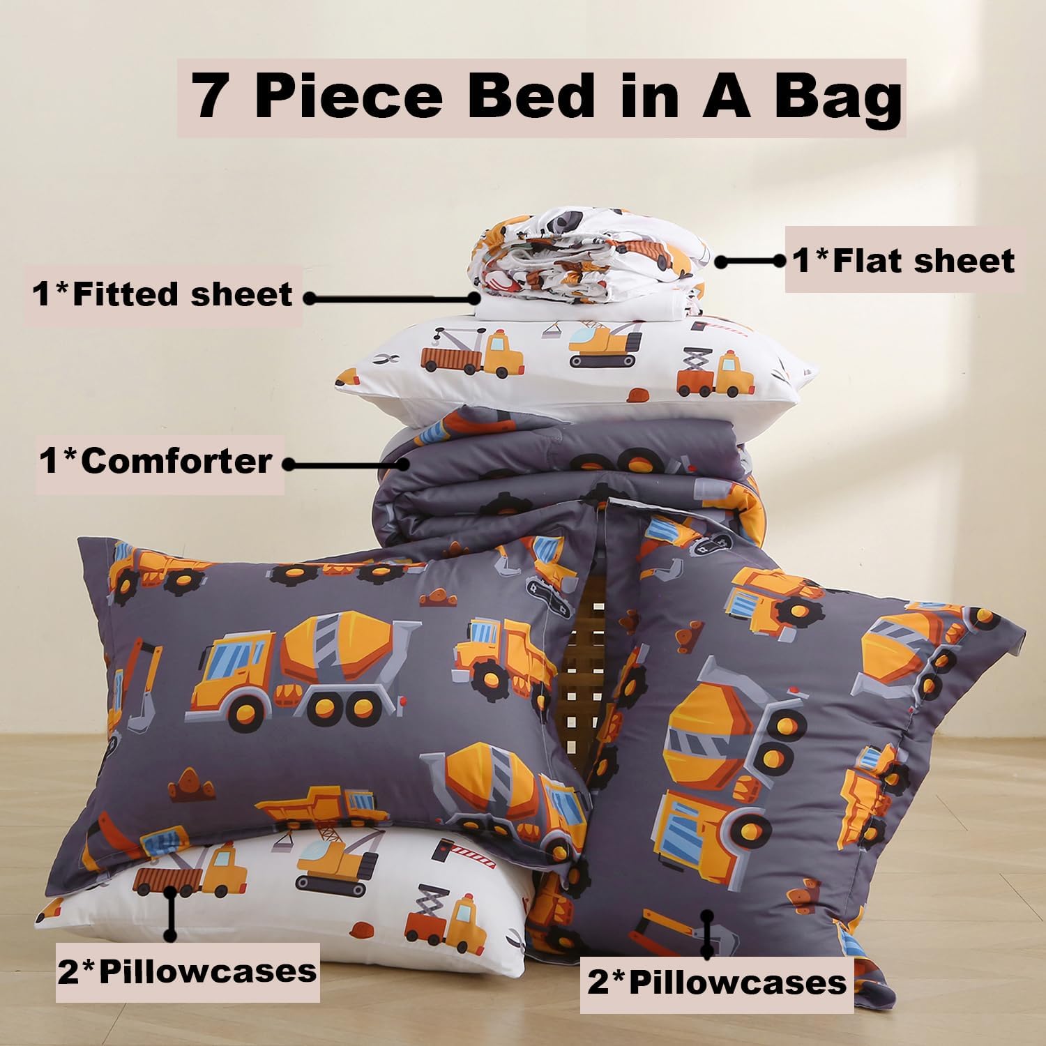 Kids Comforter Set 7 Piece Bedding Cute Car Cartoon Truck Bed Microfiber Comforter Twin Size All Season Excavator Car Truck Printed